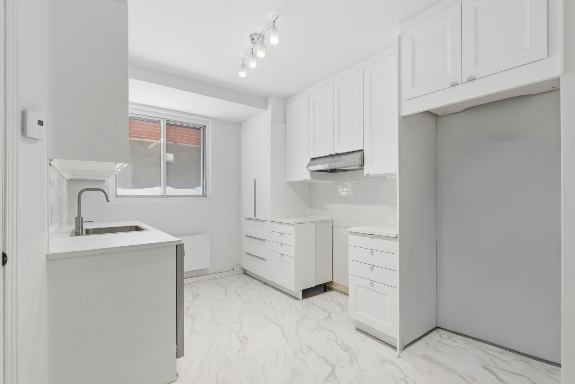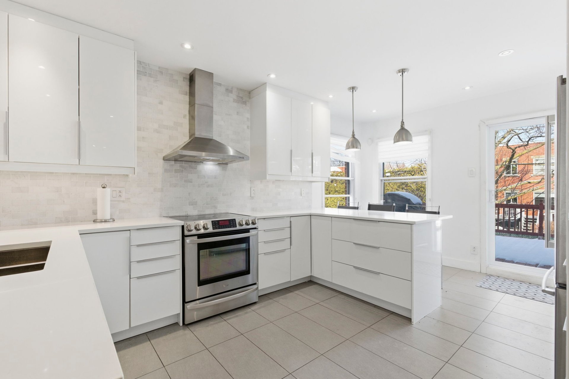 quartz, dosseret marbre, hotte cheminée et comptoir "lunch"